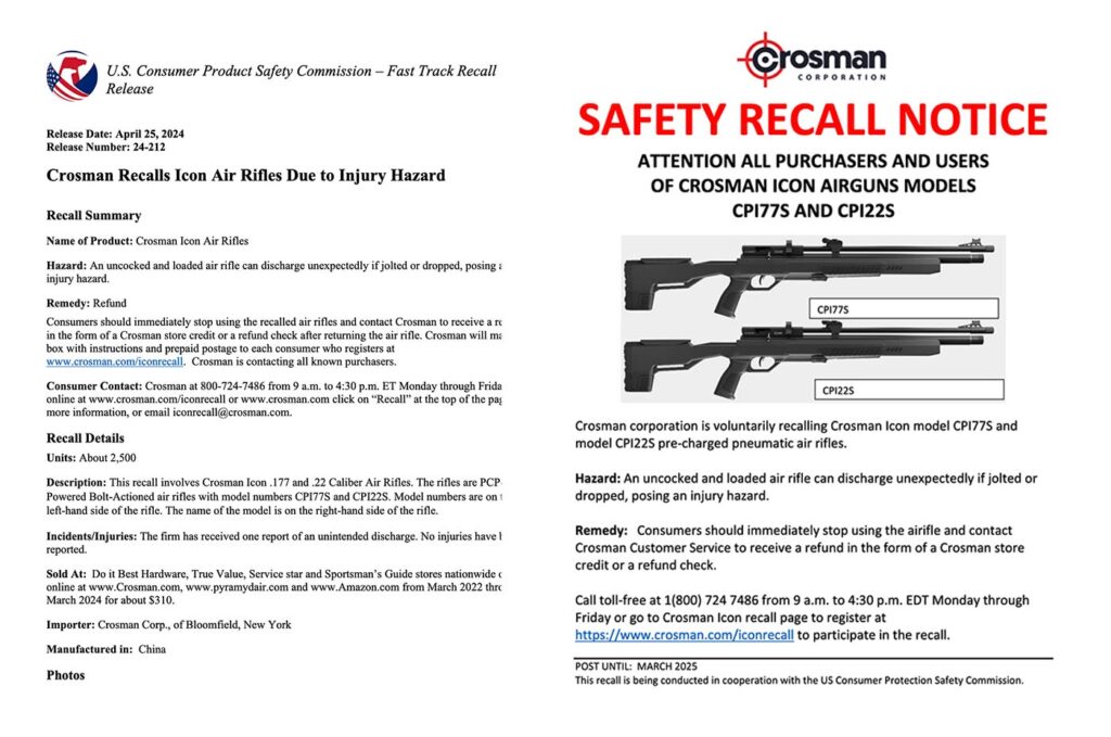 Crosman is voluntarily recalling Crosman Icon .177 and .22 Caliber Air Rifles. An uncocked and loaded air rifle can discharge unexpectedly if jolted or dropped, posing an injury hazard.