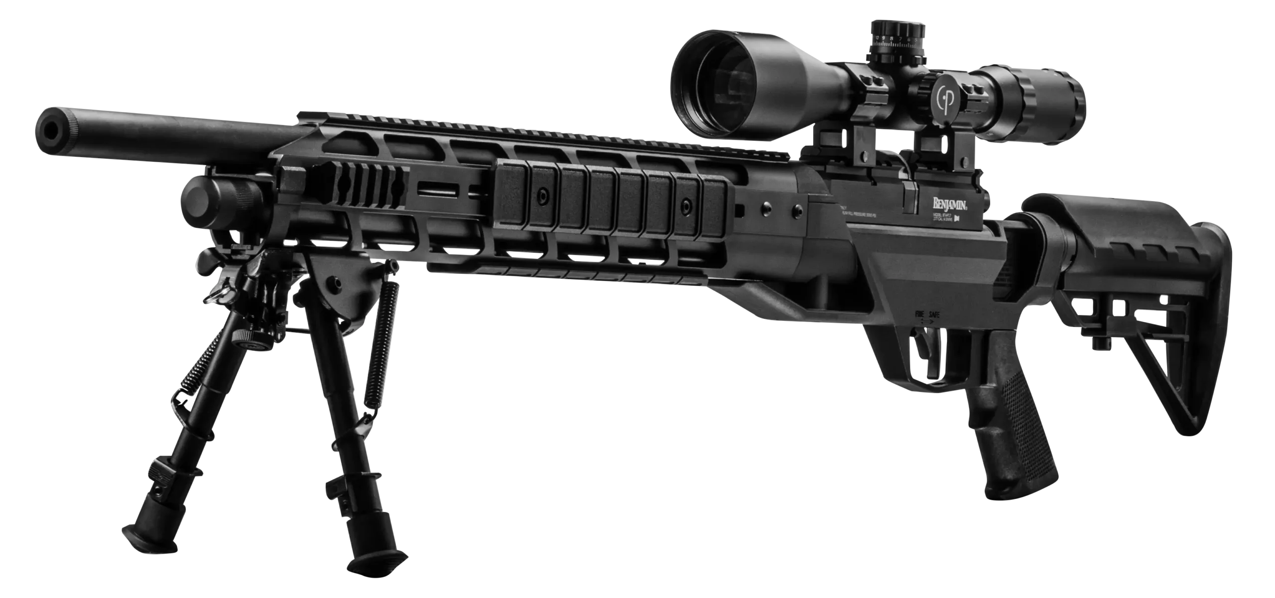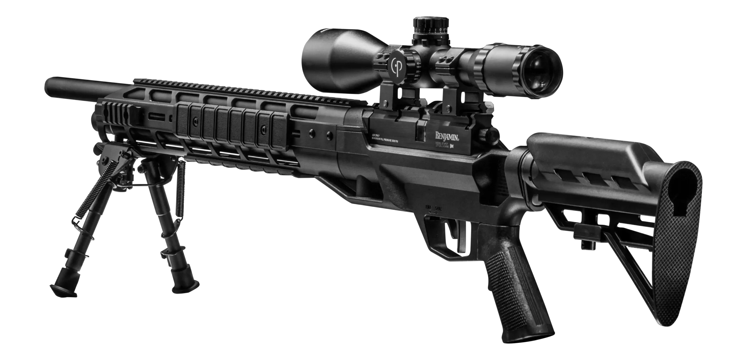 The Benjamin Armada PCP Rifle is built in America and delivers velocities ideal small game rifle and target shooter. It includes a 10-shot magazine, full suppression and gets over 30 shots per fill (16 in .25 Cal). The receiver features a machined picatinny rail and the bolt is reversible for left-handed shooters. An on-board gauge for monitoring air pressure and a crisp two-stage trigger make this a worthy addition to your gun collection.