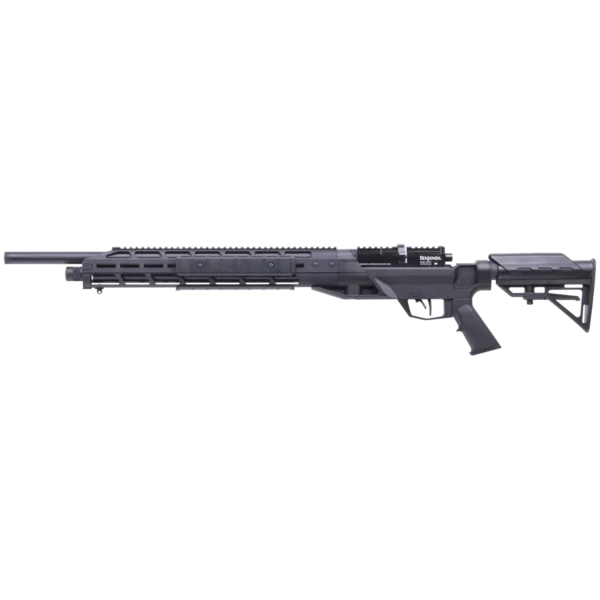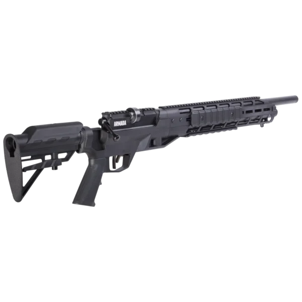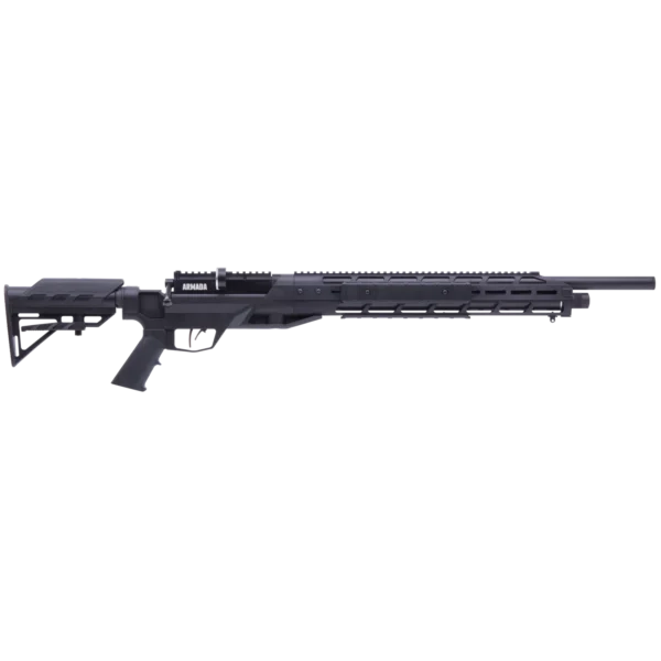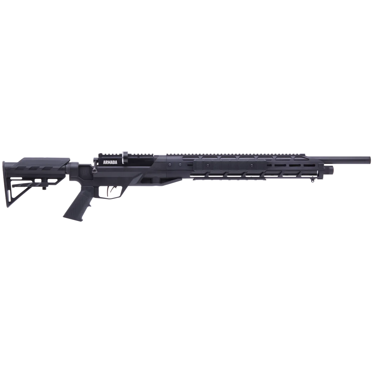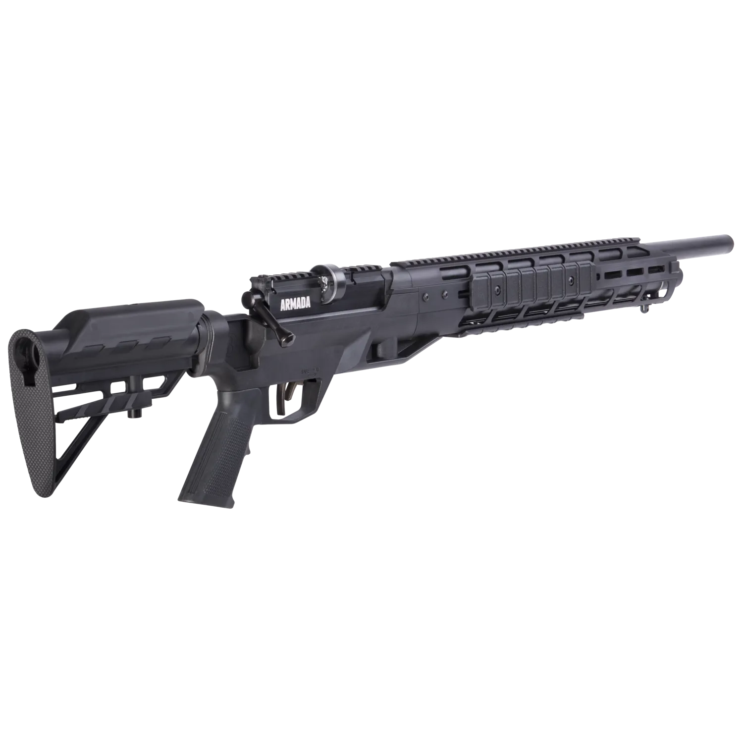 The Armada is an air rifle capable of reaching velocities of 1000 fps in the .22-caliber model or 900 fps in .25-caliber. An excellent choice for hunting small game, target shooting, or backyard plinking, the Armada PCP air rifle delivers the versatility and performance today’s air gunners require. The Armada gets more than 30 shots per fill, and it comes with a 10-shot magazine. It also comes equipped with full suppression, a crisp two-stage trigger, and an onboard gauge for convenient air pressure monitoring. The reversible bolt accommodates left-handed shooters and a machined Picatinny rail lets you add your preferred accessories.