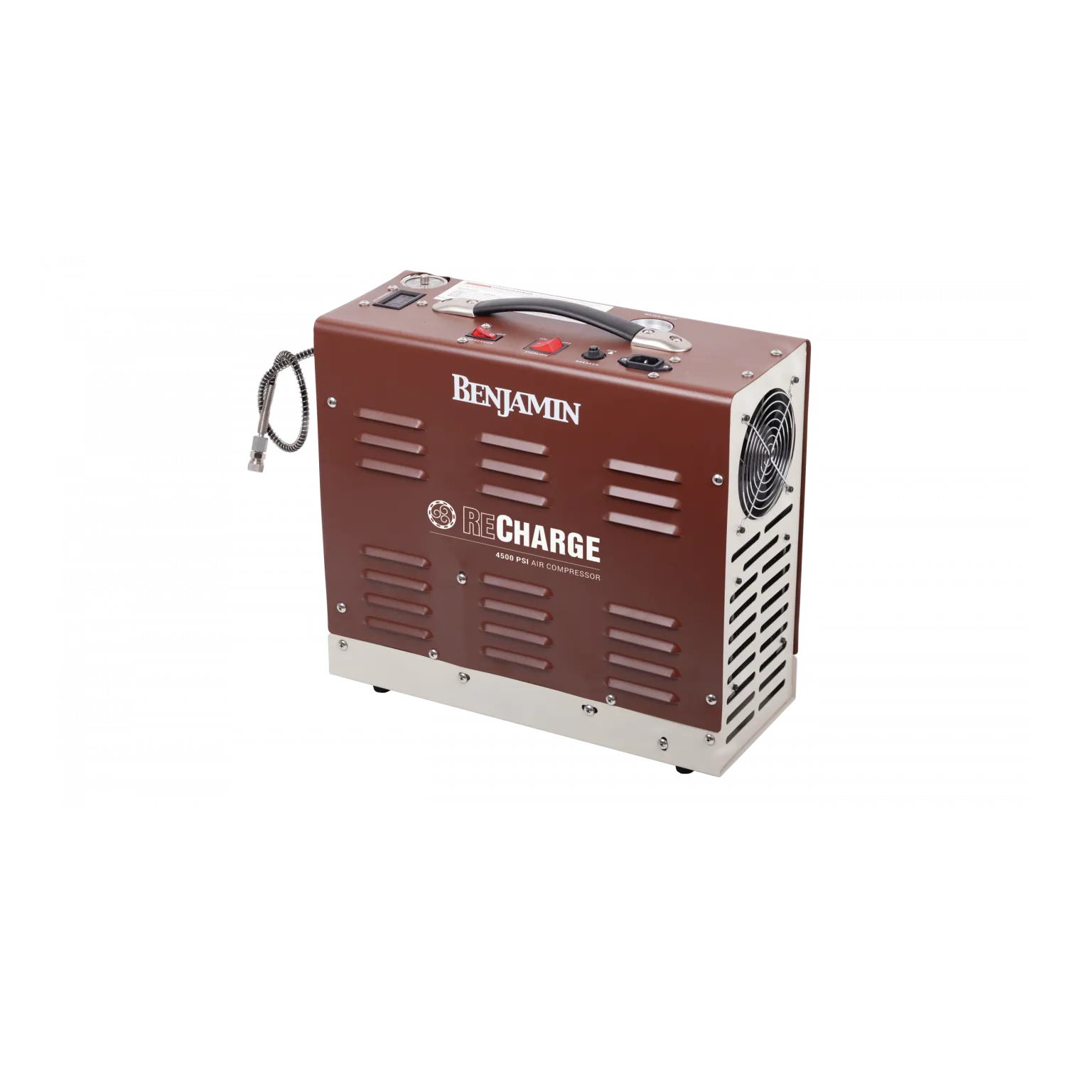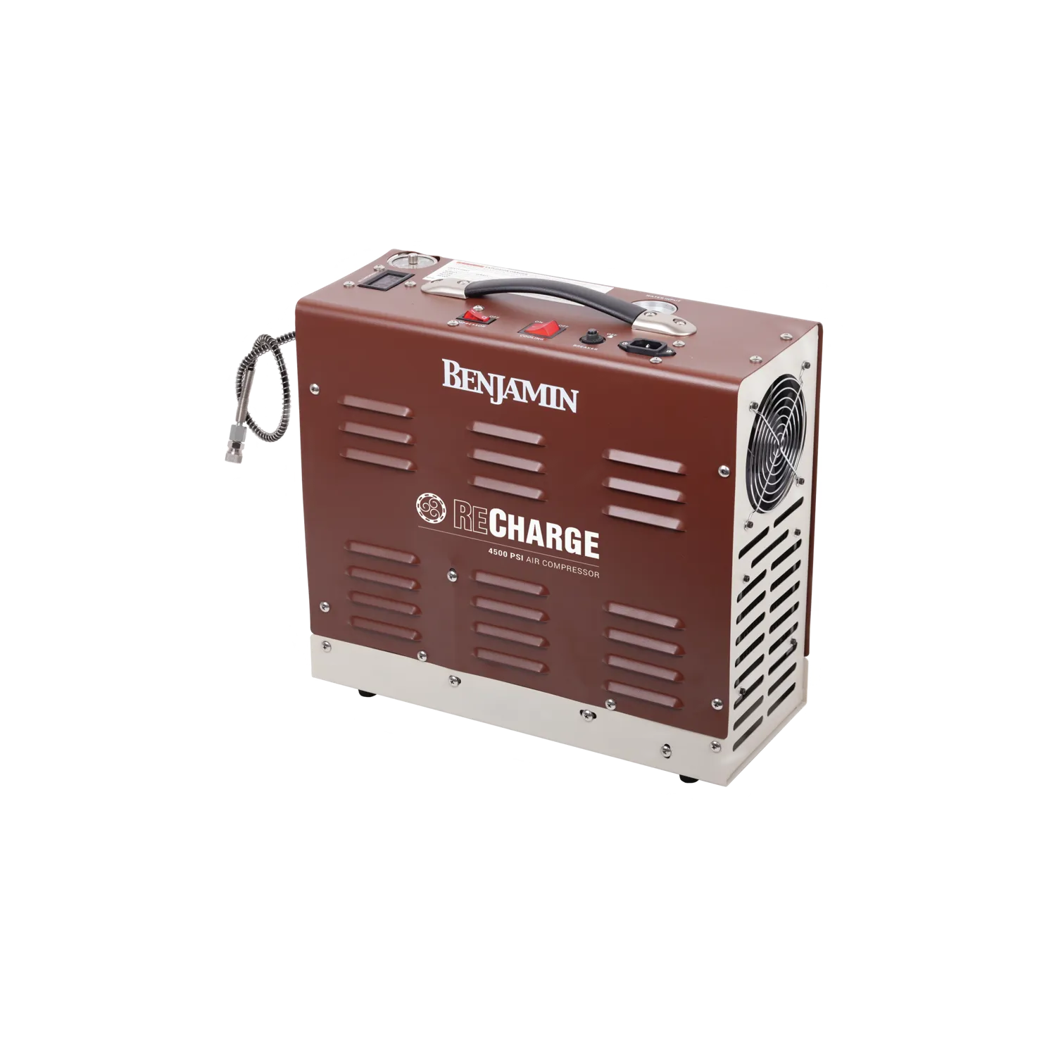 The Benjamin Recharge Compressor makes refilling your air gun at home simple, saving you the strain of pumping by hand or finding another solution. Packed with thoughtful features, this high-pressure air compressor is ready to go right out of the box. Add water and compressor oil, and plug it into a standard U.S. 3-prong 110V outlet. Its integrated automatic shutoff feature allows you to set your preferred pressure without worrying about overfilling your air gun, plus an automatic 40-minute shut-off and a safety burst disc prevent potentially dangerous excess pressure. The Benjamin Recharge Compressor reaches a maximum fill pressure of 4,500 psi. Depend on this water and air-cooled compressor to fill your air guns, paintball cylinders, and tanks up to 6.8 liters.
