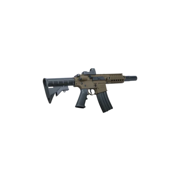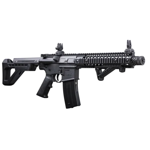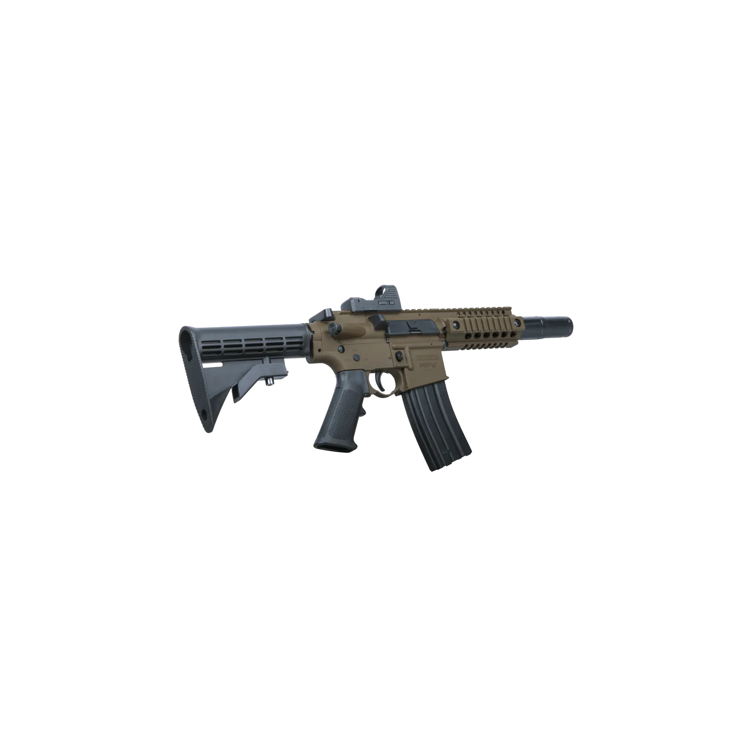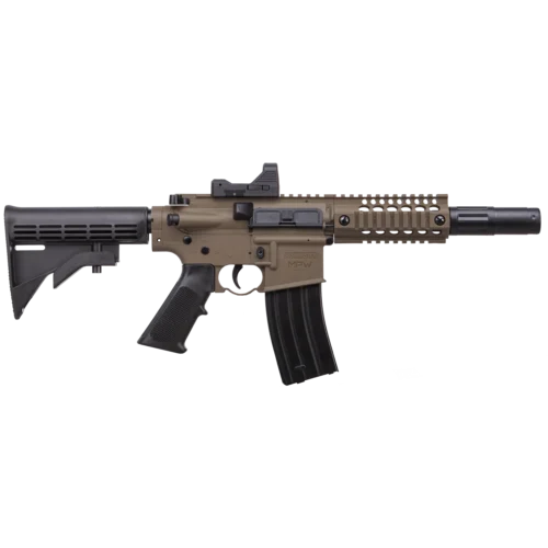 The Bushmaster MPW, full-auto BB air rifle slings BBs at a blistering 430 fps with a rate of fire at an astounding 1400 rounds per minute! Fueled by two 12-gram CO₂ cartridges housed in the 25-round magazine, the dual-action selector lets you choose between semi and full-auto capability. The air rifle features a genuine real-feel and comes with a 6-point adjustable rear stock, moveable angled foregrip, and Picatinny rail for the limitless mounting of flashlights, lasers, and other accessories. Comes with a thumb-selector style safety to ensure proper and safe handling, Red Dot sight, removable pop-up sights, and an adjustable rear sight.