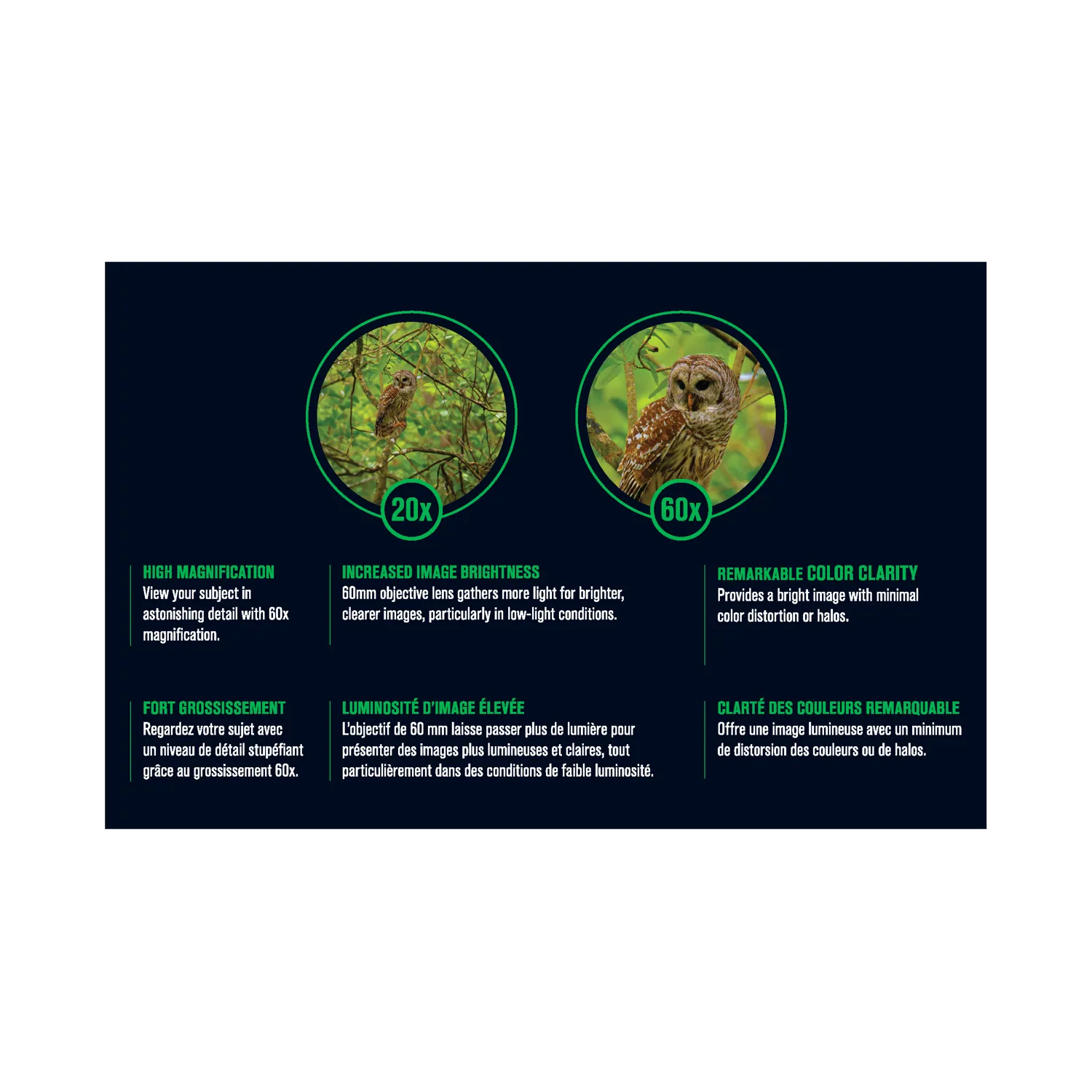 The 20-60x Spotting Scope boasts a remarkable 20-60x magnification range, allowing users to bring distant objects in close for detailed observation. Its 60mm objective lens maximizes light transmission, delivering bright and clear images even in low-light conditions.