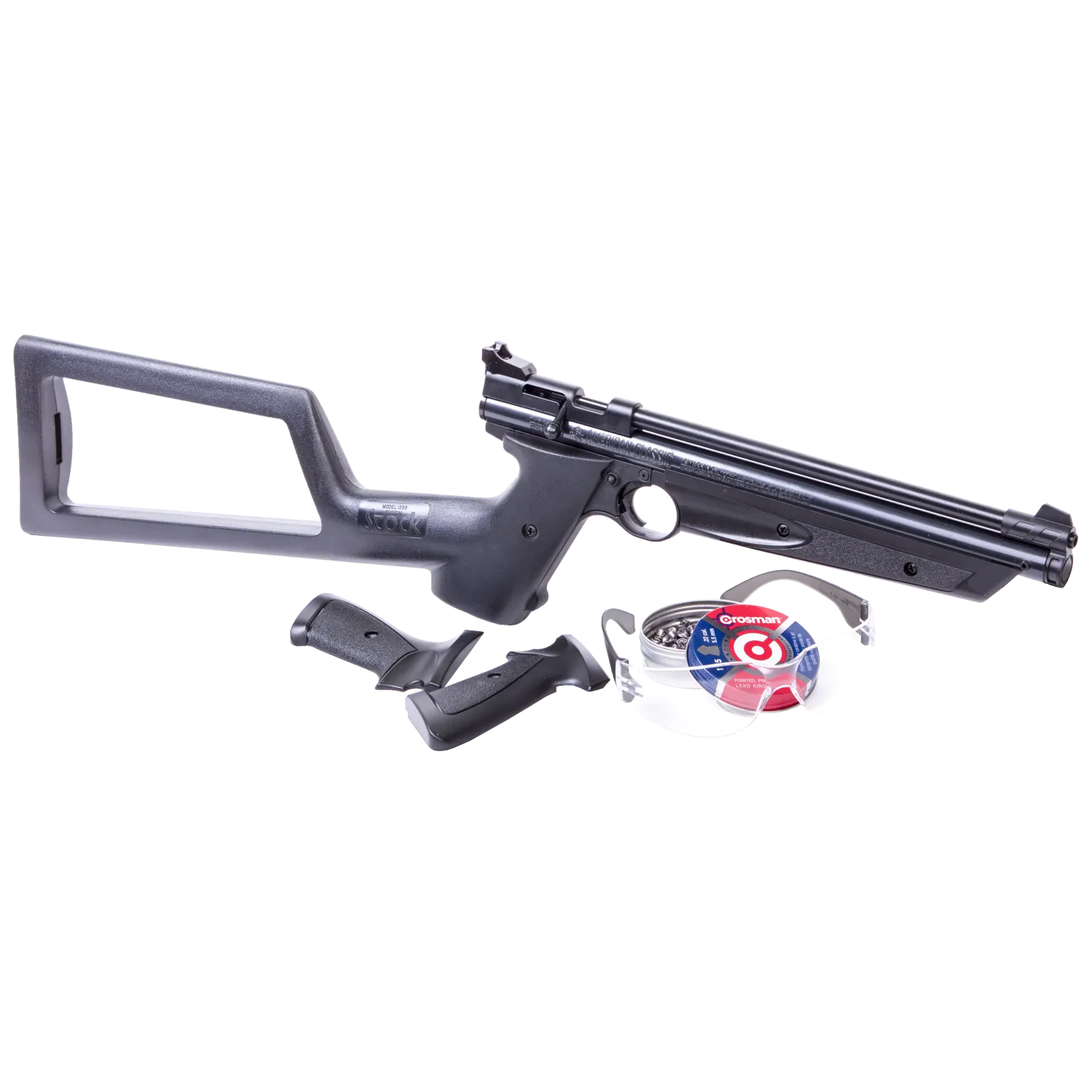 The Crosman Classic Air Pistol Kit is the ultimate backyard plinker. This .22 caliber pellet pistol features a single shot bolt action for easier cocking and loading and a rifled steel barrel for accuracy. Get variable pump power with the easy-pump forearm and control the velocity up to 460 fps for your style of target shooting. Comes with a fully adjustable rear sight and fixed-blade front sight, shoulder stock, pistol grips, shooting glasses, and 175 rounds of .22 caliber pellets.