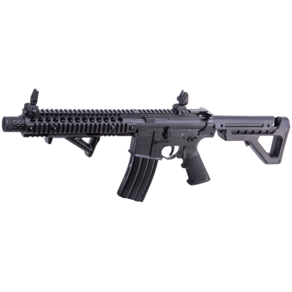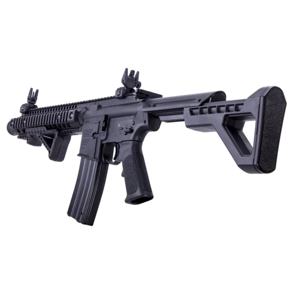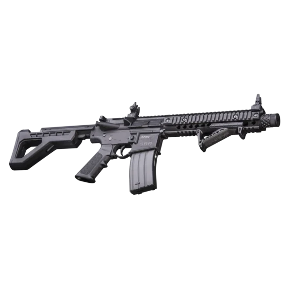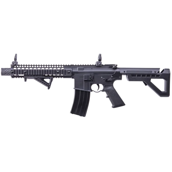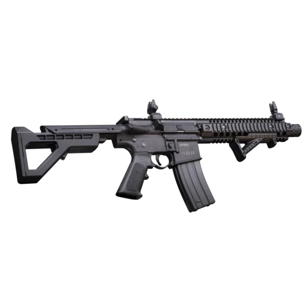 Get your hands on an air gun that can do it all. The Crosman DPMS SBR is a full/semi-auto air rifle that fires BBs at a blistering 430 FPS at a rate of 1400 rounds per minute! Powered by two 12-gram CO₂ cartridges, the SBR’s excellence is further defined by features like its dual-action selector, a genuine real-feel body, and a six-point adjustable rear stock.