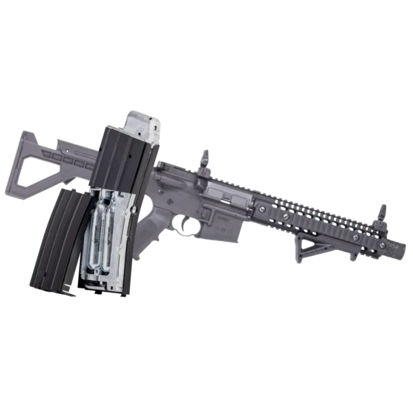 - Two 12-gram CO2 cartridges power the SBR Rifle, delivering velocities of up to 430 FPS