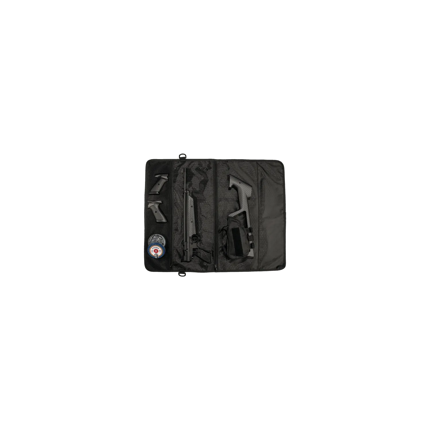 - Outfitted with a shoulder stock, stock pouch, pistol grips, 400 count of .22 caliber pellets and roll-out carry case