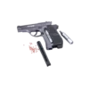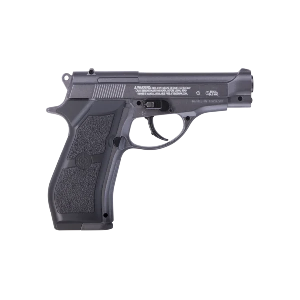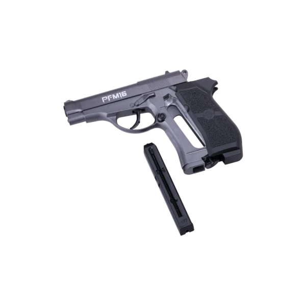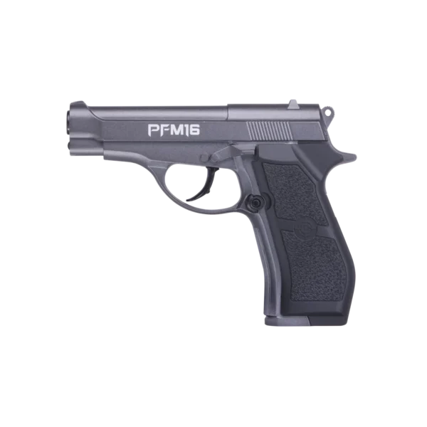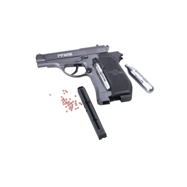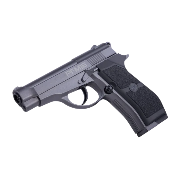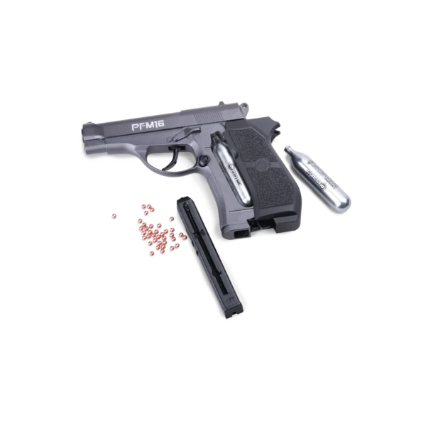 With a realistic weight and feel, the Crosman PFM16 CO2 BB pistol is perfect for plinking or honing your marksmanship fundamentals. This compact, all metal, CO2 pistol slings standard 4.5 mm BBs up to 400 fps firing as fast as you can pull the trigger. Featuring comfortable grips, a precision steel barrel, 20 round drop out shot clip, removable grip panel for easy CO2 replacement, fixed blade front sight and adjustable rear sight to help stay on target. “Take it Outside” with Crosman.