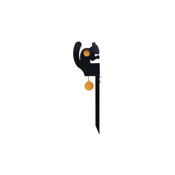Keep your skills in tip-top shape with the Crosman Resetting Field Target resembling the bane of all birdfeeders, the squirrel. Keep the furry rodents at bay by practicing with this replica target with a 1.5-inch kill zone and a 2-inch resetting target. The heavy-duty steel construction is designed for .177 caliber up to 1200 fps and .22 caliber up to 950 fps (air guns only). Not for use with BBs. Squirrel silhouette measures 8-inch tall. With a stake, the target is a total of 18-inch tall. Enjoy practicing with no strings to pull or need to go downrange.