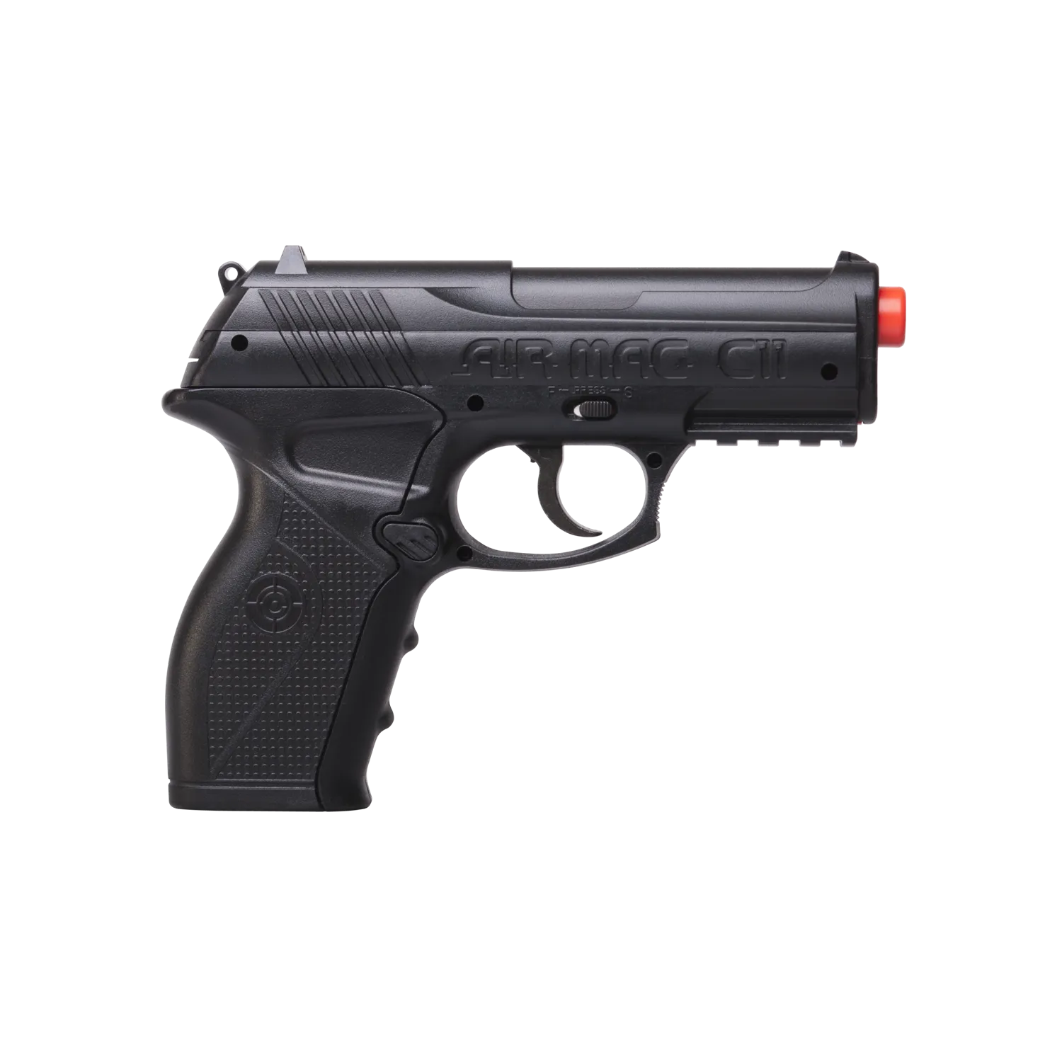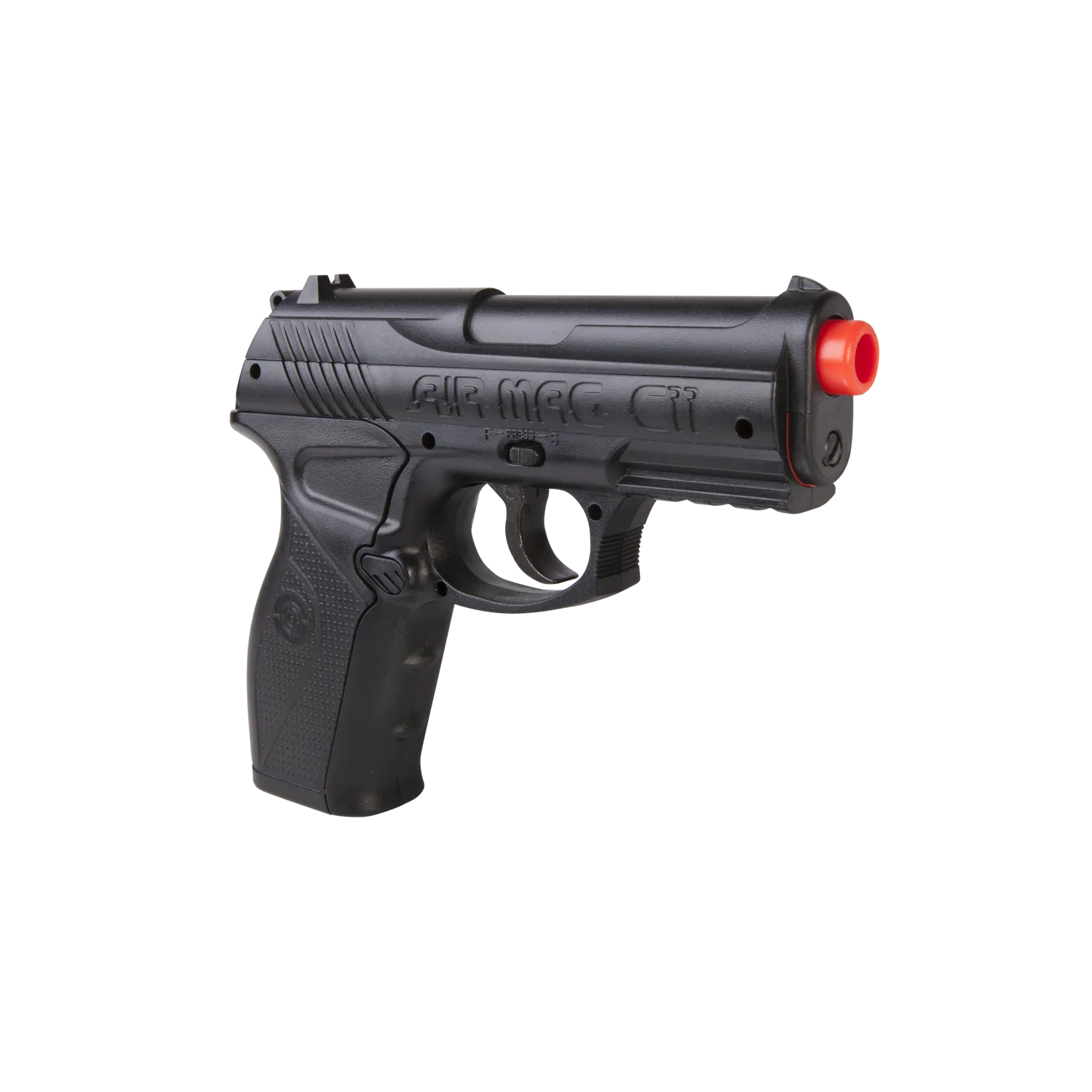 CO2 power gives the Air Mag C11 impressive strength, while its substantial weight and comfortable grip give it a truly realistic quality. The Air Mag C11 features an under-barrel, Weaver-style rail and a quick-release, 16-round clip. With velocities of up to 400 fps, this is a reliable, convenient and inexpensive alternative to real pistols for training and practice purposes.
