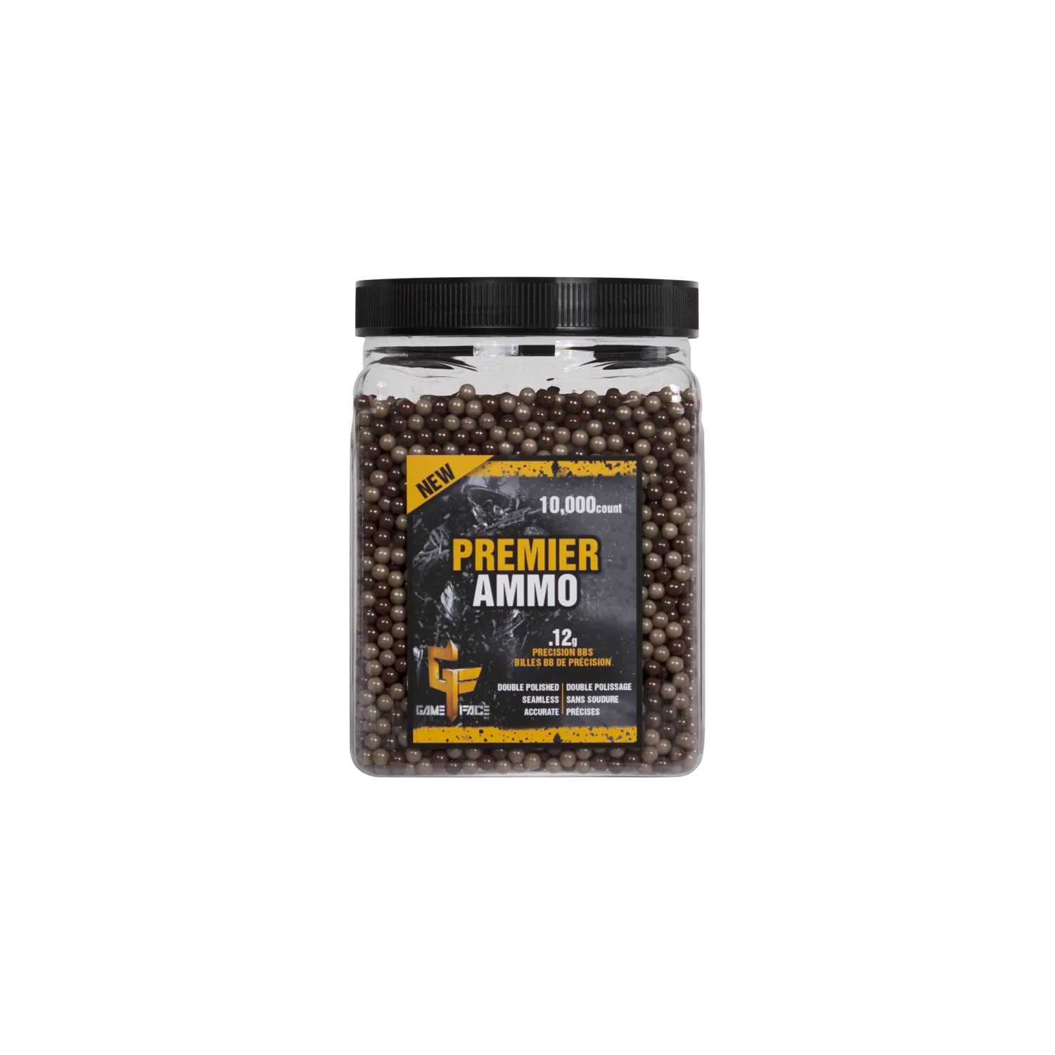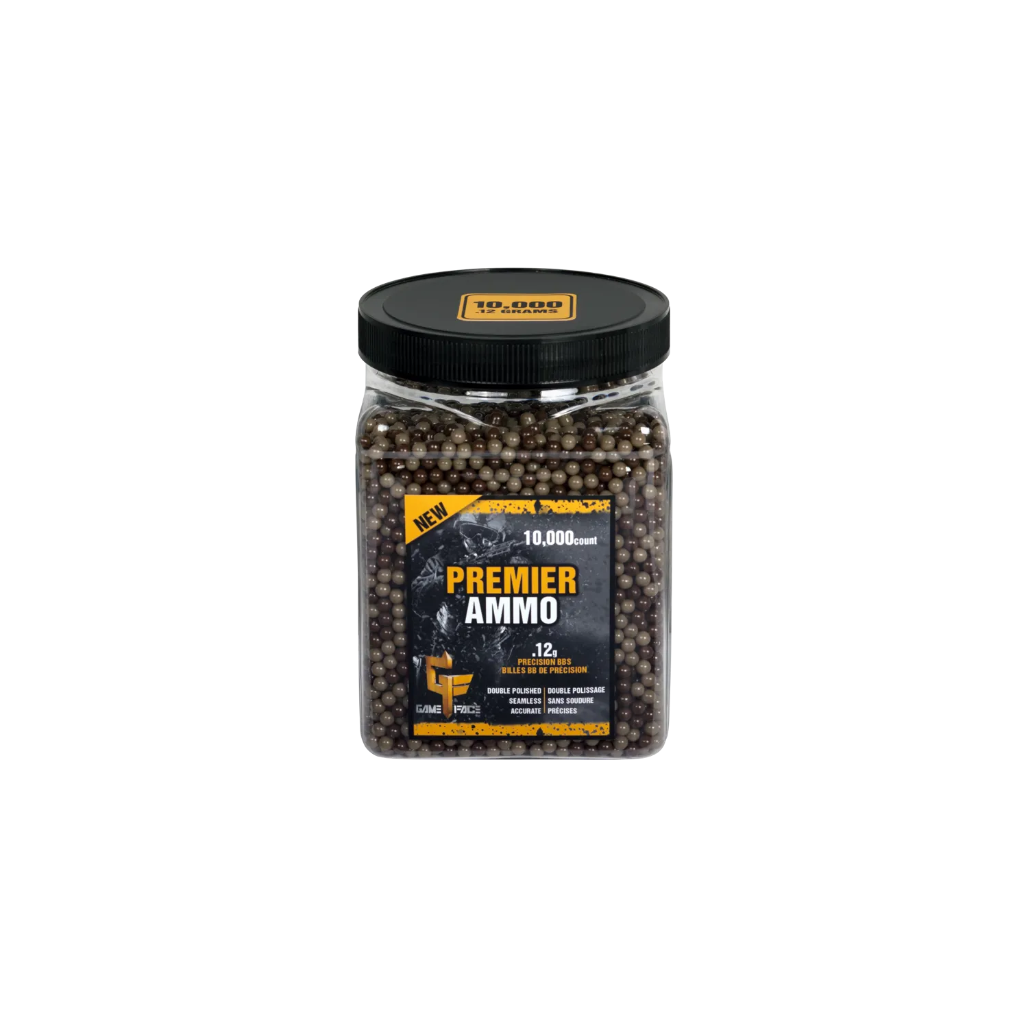 Dominate every match with Game Face Premier Airsoft Ammo. Each .20-gram 6mm BB is perfectly polished and seamless, designed to fly straight and feed flawlessly through AEGs, gas pistols, or spring-powered rifles. This 10,000-count bottle keeps you supplied through long skirmishes or all-day training sessions.