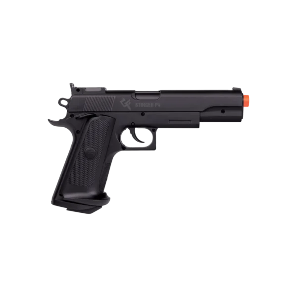 - Pistol features 14 round magazine and fixed blade front and rear sights